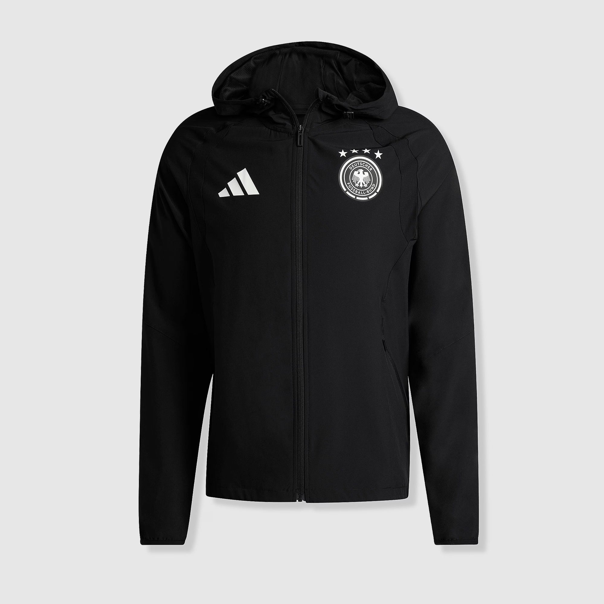 Stand with the four-time world champions as they look to draw level with Brazil and become the joint-most successful nation in World Cup history with the adidas Germany 2026 Tiro Travel Windbreaker Jacket in Black, a comfortable overlayer that radiates German pride.