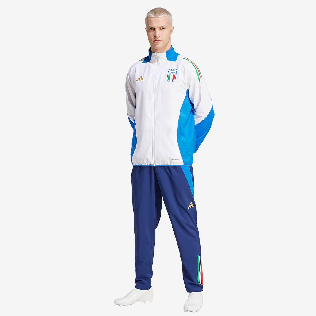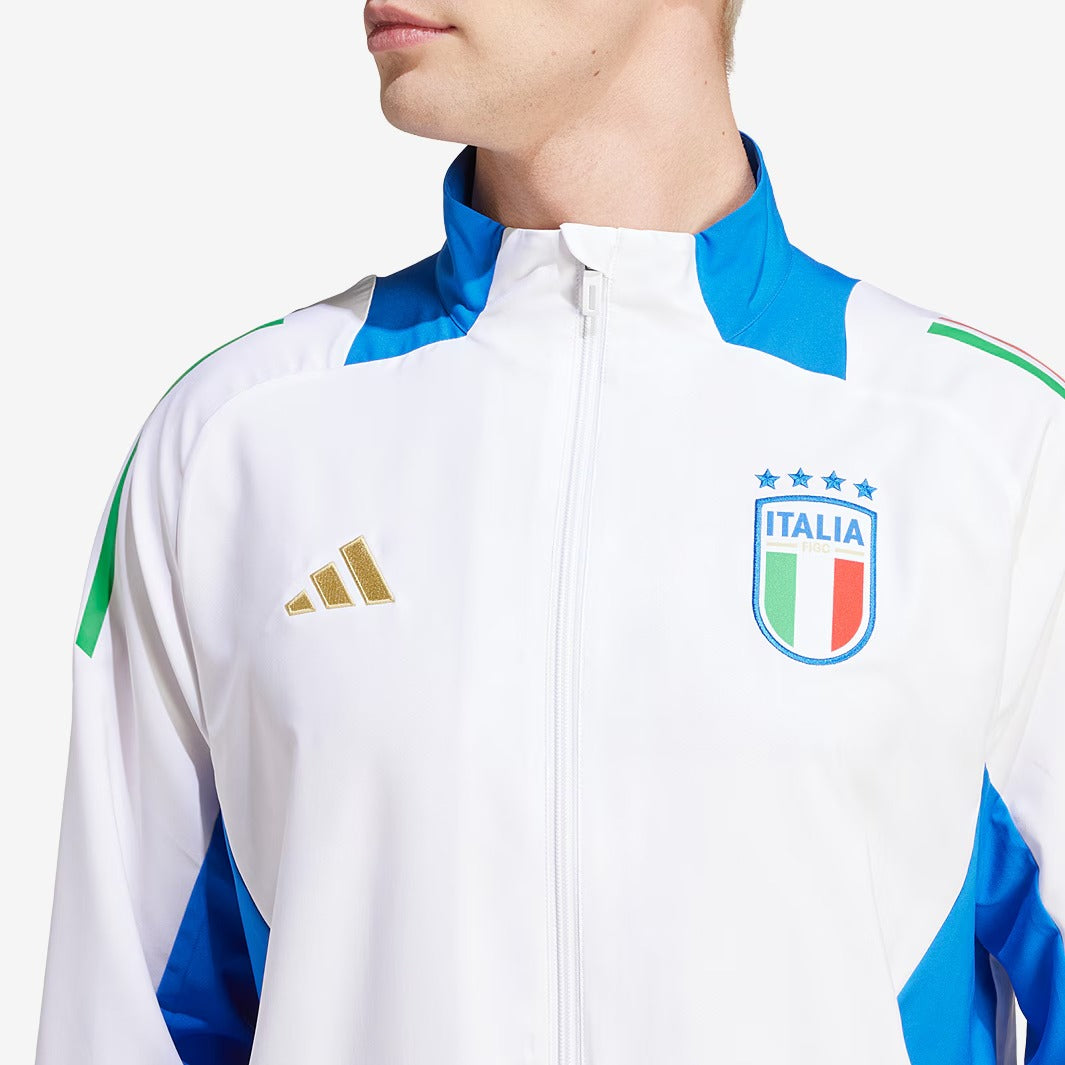 Part of the Italy warm-up range, the 2024 pre-match jacket is worn by Federico Dimarco, Giacomo Raspadori, Davide Frattesi, Matteo Darmian and the rest of the first-team squad as they work to improve their skills every day on the training pitch and prepare for Euro 2024. The classic white and blue change colours are enhanced with Tricolore-inspired green, white and red detailing at the shoulders, and the iconic national crest completes a look packed with patriotism.
