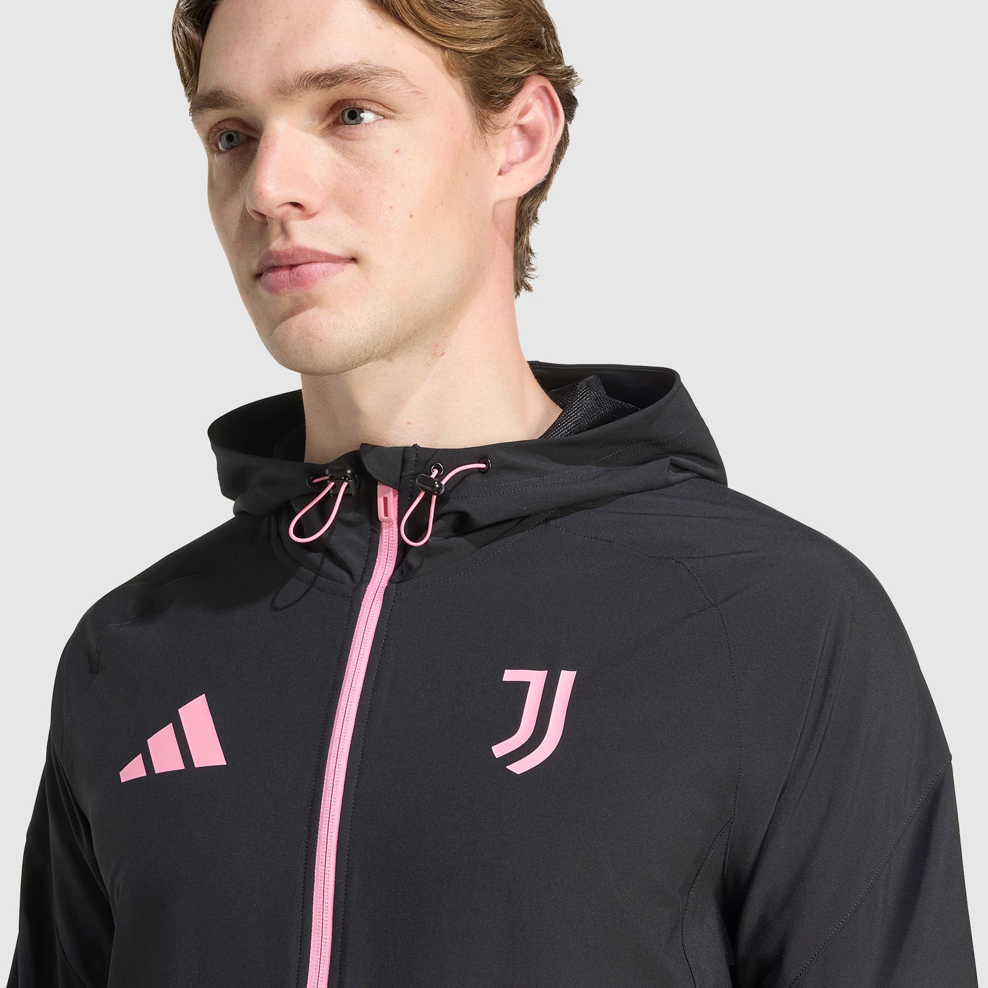 Support the Old Lady as they set their sights on a return to their rightful place at the top of Italian and European football with the adidas Juventus 25/26 Competition Vis Tech Jacket in Black/Bliss Pink, a stylish overlayer with reflective elements for better visibility at night.