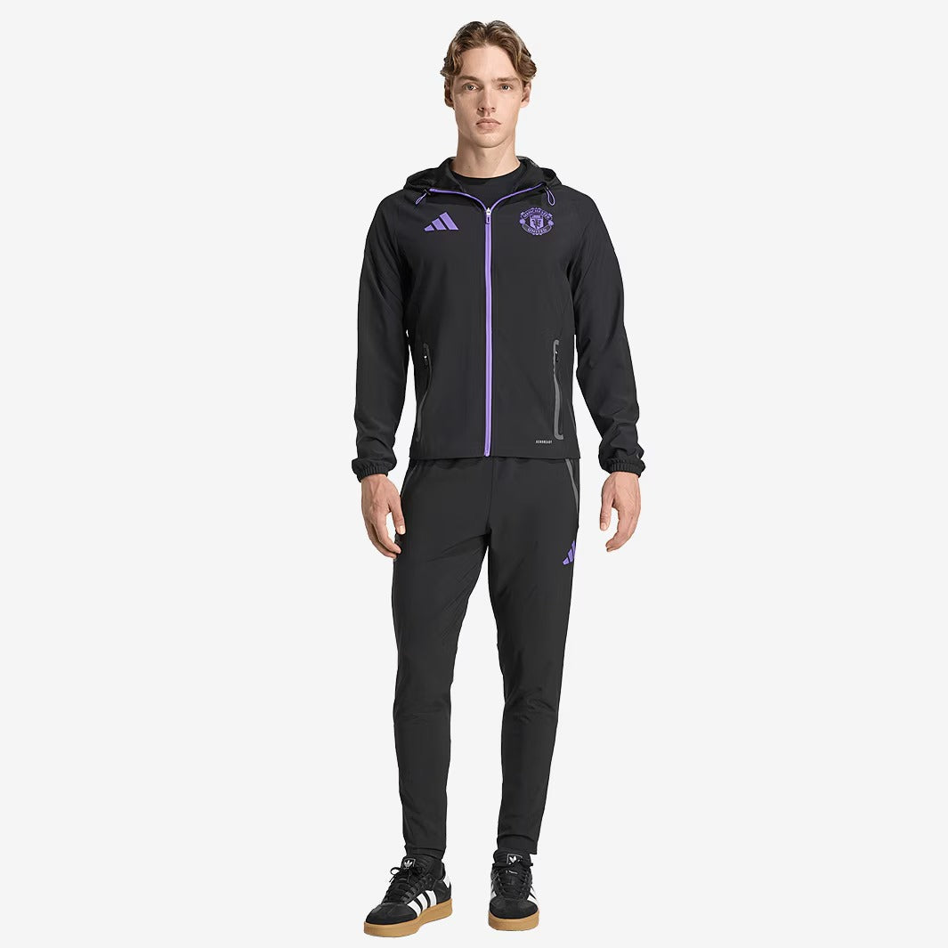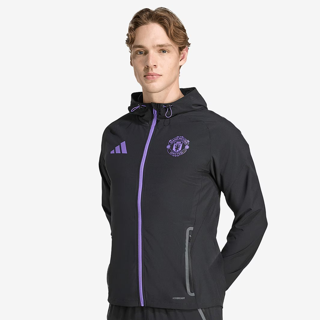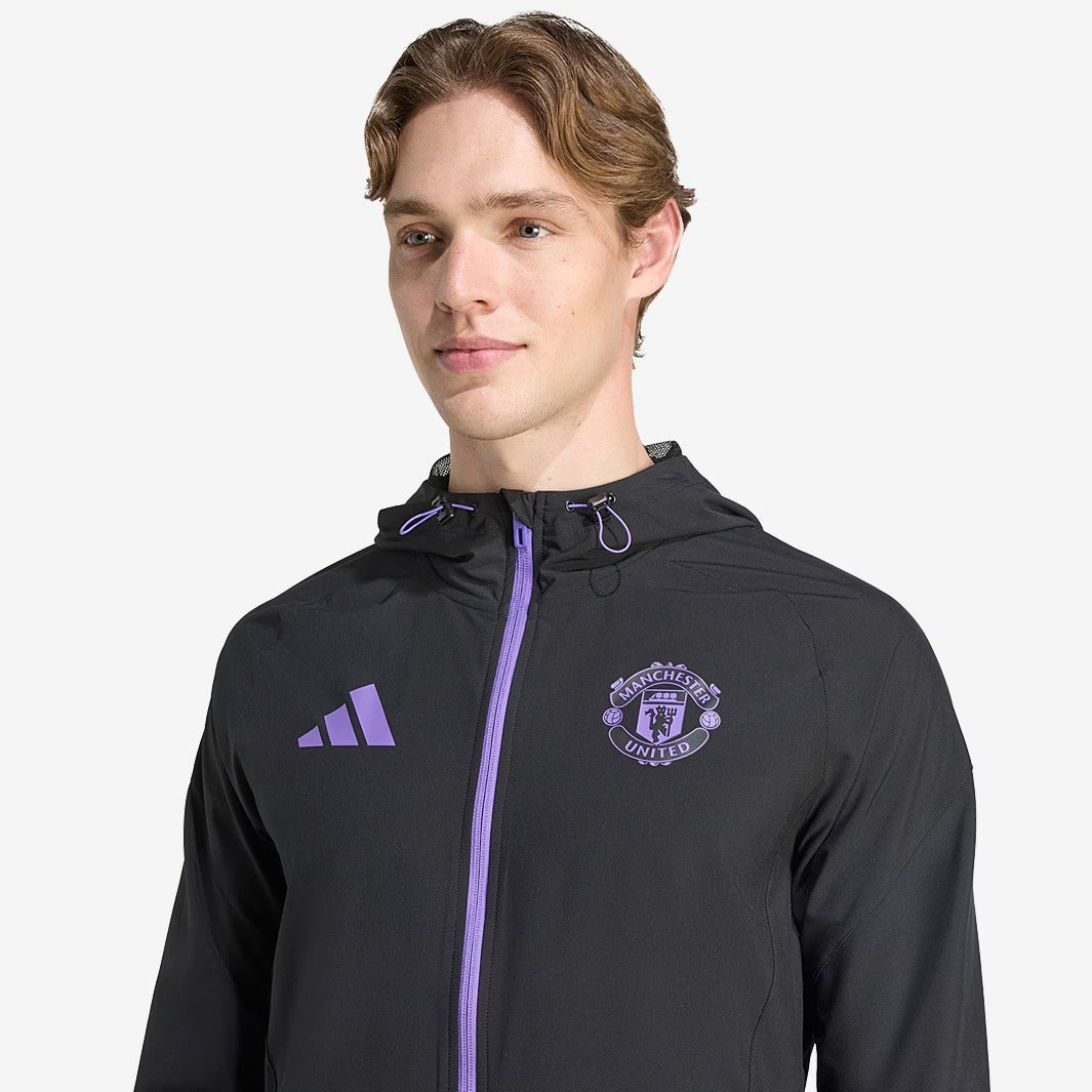 Back United as they rebuild and set their sights on a return to European football with the adidas Manchester United 25/26 Competition Vis Tech Jacket in Black/Purple Rush, a stylish overlayer with reflective elements for better visibility at night.