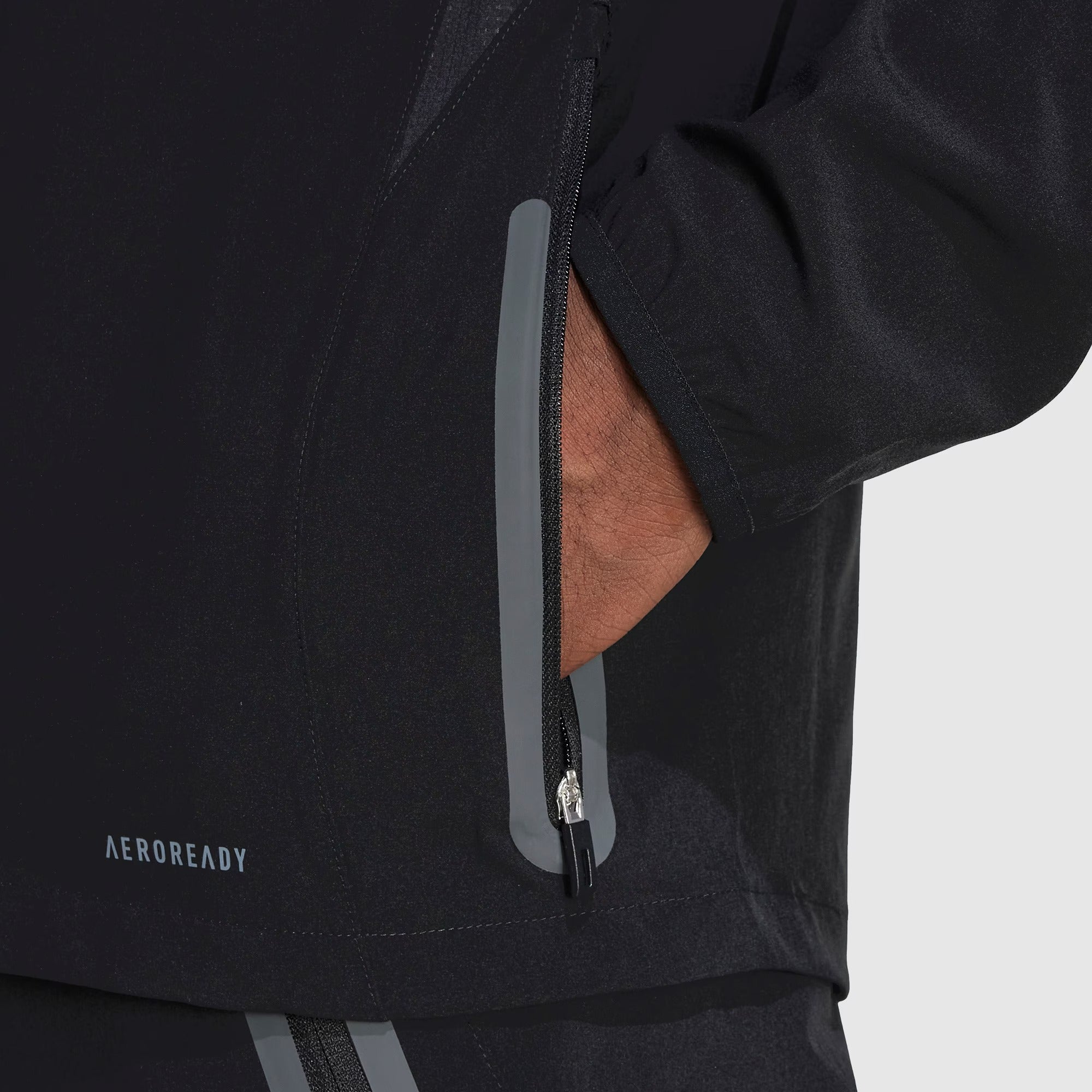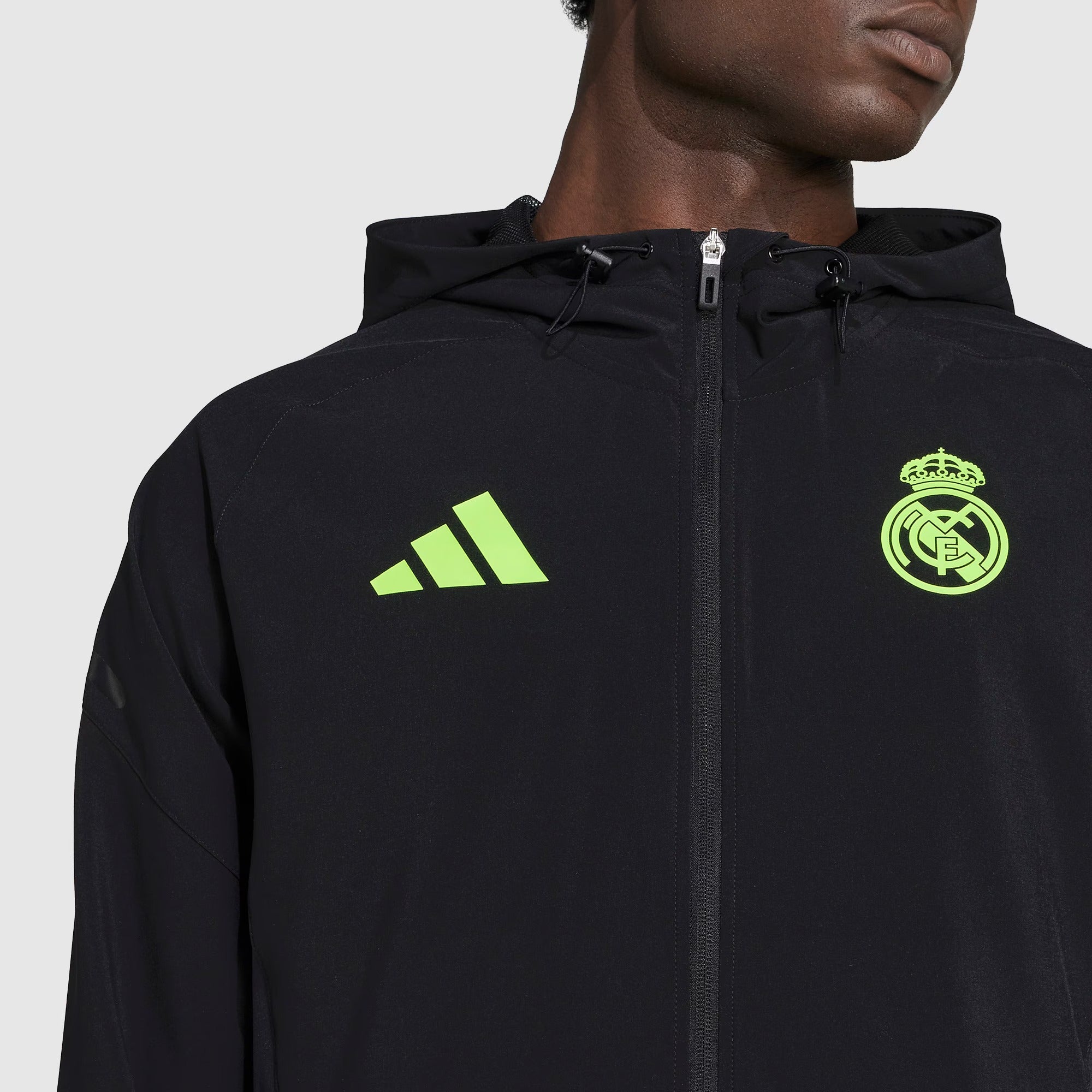 Back Los Merengues as they look to reclaim their spot at the top of Spanish and European football with the adidas Real Madrid 25/26 Pro Vis Tech Jacket in Black/Lucid Lemon, a stylish overlayer with reflective elements for better visibility at night.