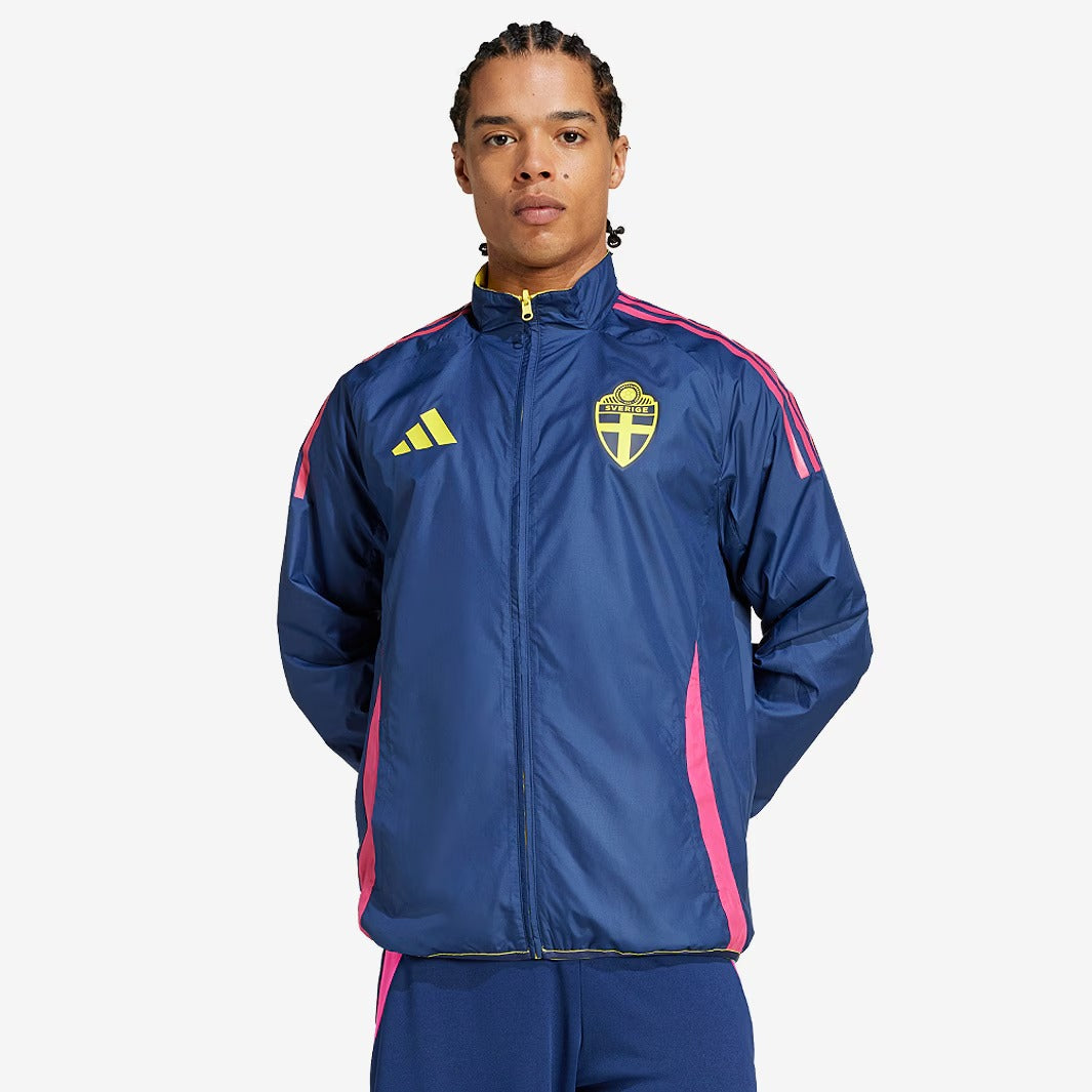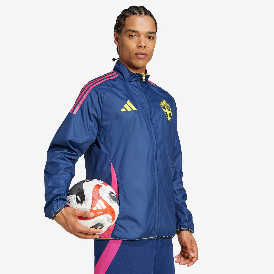 Back Sverige as they look to rebuild and qualify for the 2026 World Cup with the adidas Sweden 2024 Anthem Jacket in Bright Yellow/Team Navy Blue 2.