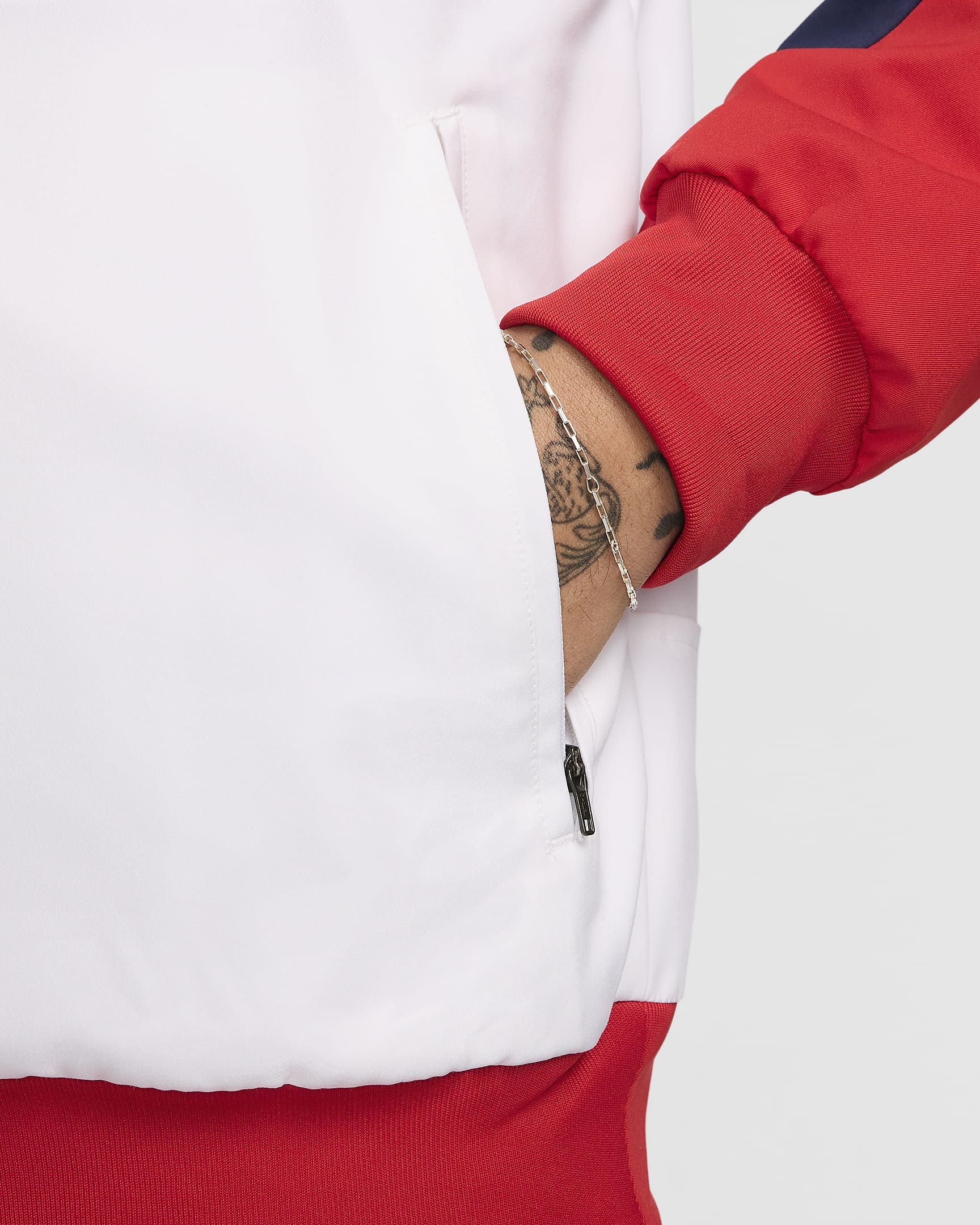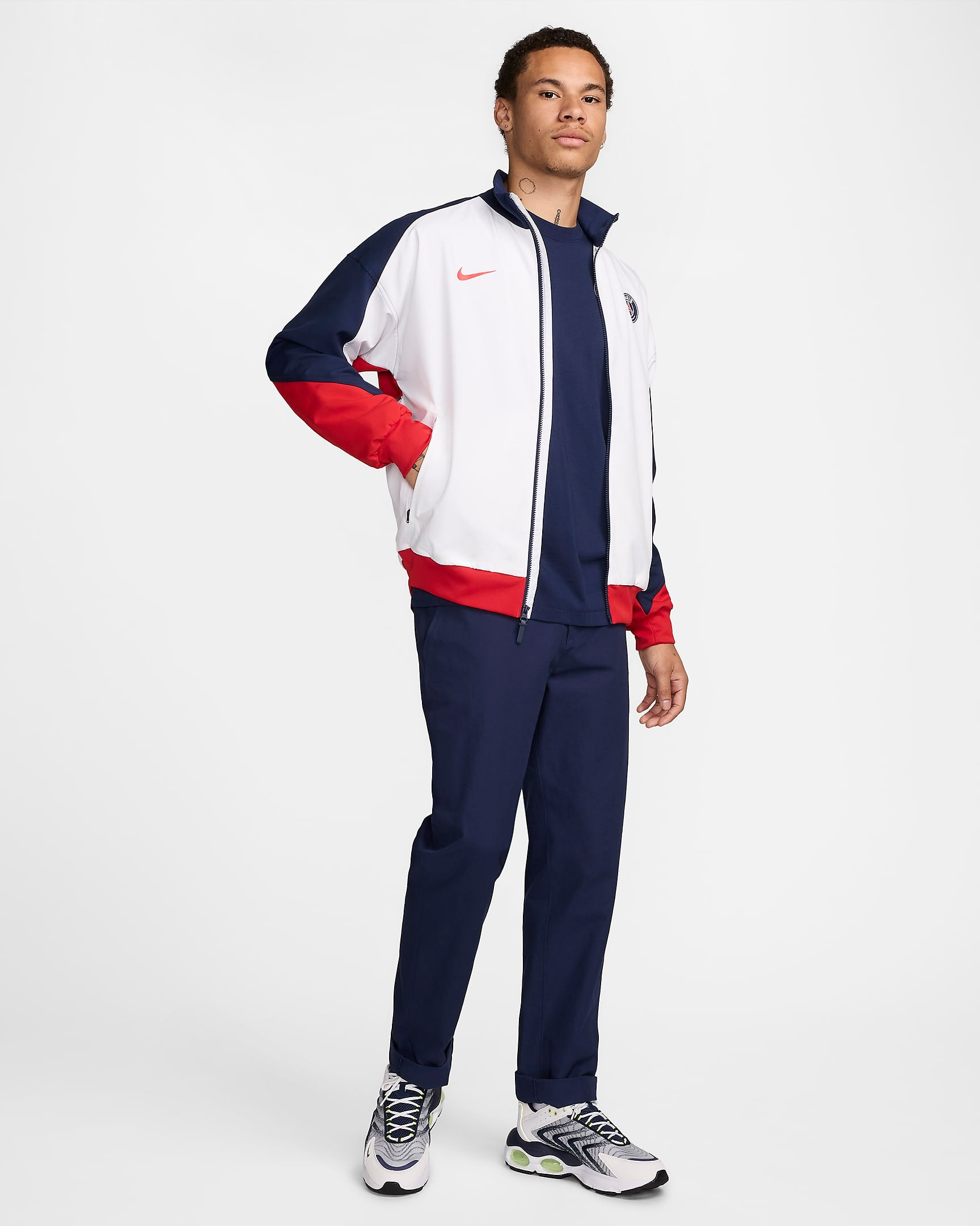 This Paris Saint-Germain tracksuit jacket is a zip-up design you can wear when warming up for the game or cheering on your favourite team. With design details specifically tailored for football's rising stars, a loose fit works together with sweat-wicking technology to help keep you cool and composed while you fine-tune your skills.