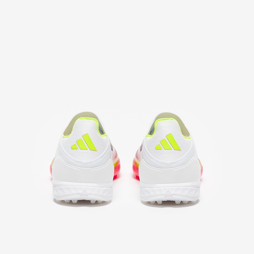 Redefine speed wearing adidas F50 Pro Laceless TF football shoes in White/Black/Solar Yellow.