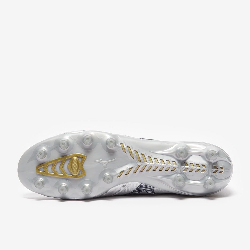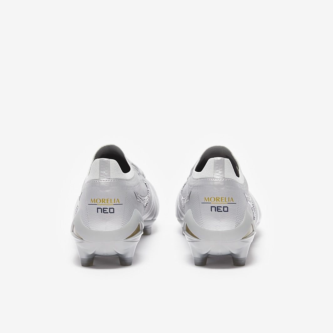 Play beyond fast wearing Mizuno Morelia Neo IV Beta Made In Japan FG football boots in Galaxy Silver/Gold/Cool Gray.