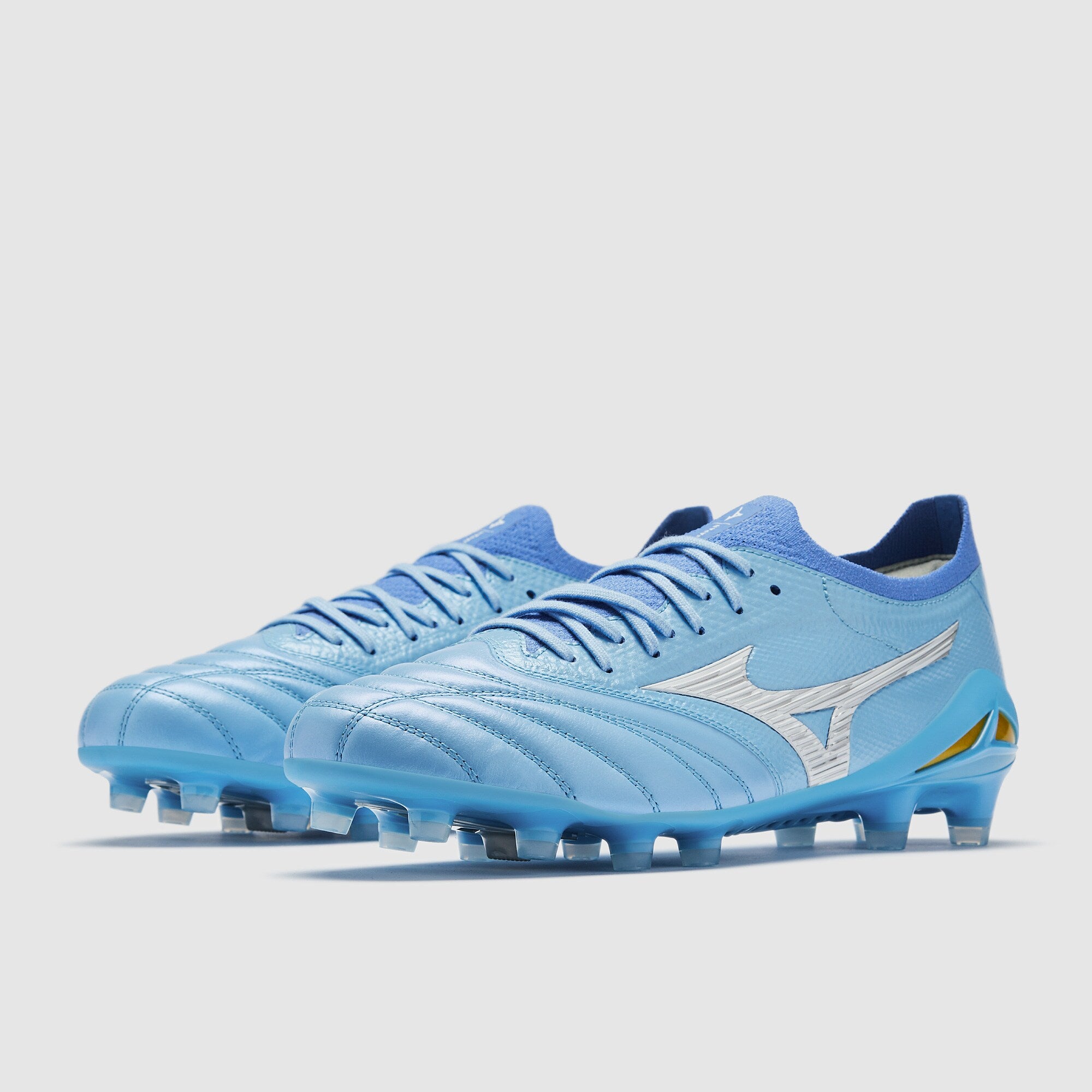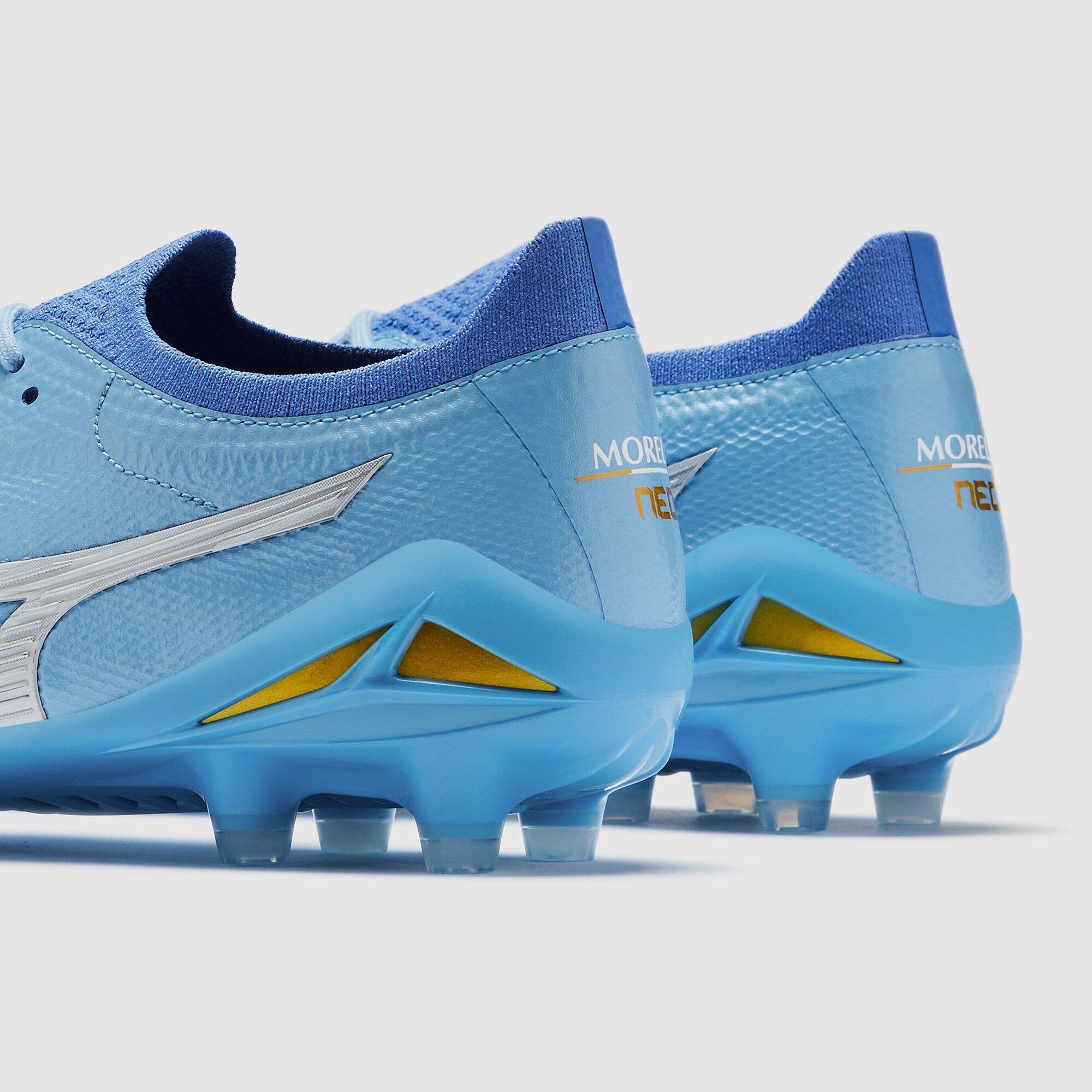 Play beyond fast wearing Mizuno Morelia Neo IV Beta Made In Japan FG football boots in Celeste/White/Ultramarine.